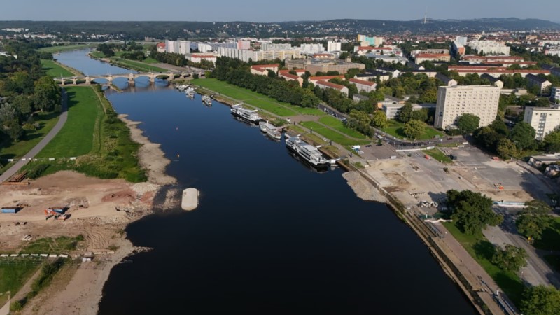 Seit dem Mittwoch um 13 Uhr ist der Elberad- und Fußweg am Neustädter Elbufer im Bereich der Carolabrücke wieder freigegeben. Weiter wird noch an der Fahrrinne sowie am Busparkplatz gearbeitet.