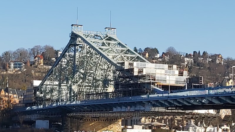 Dresden und seine Brücken, ein täglicher Kampf gegen Rost und Verschleiß. DieLoschwitzer Elbrücke oder eher bekannt als "Blaues Wunder" wird erneut verhüllt.