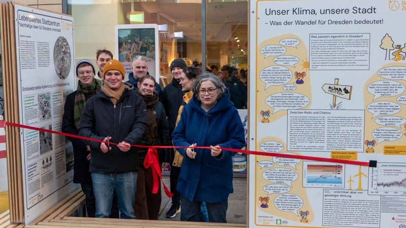 Vor der Prager Straße hat die Initiative DresdenZero am Freitagnachmittag eine Sitzbank mit Infotafeln eröffnet.