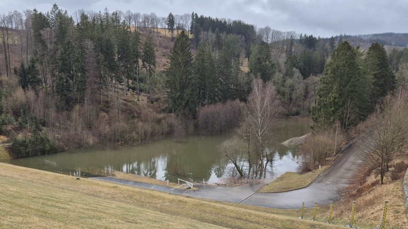Das Hochwasserrückhaltebecken Glashütte (Lkr. Sächsische Schweiz – Osterzgebirge) wird derzeit eingestaut, um einen Funktionstest am Brießnitzbach durchzuführen