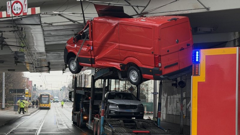(ots) Die Feuerwehr Dresden wurde am Samstagmittag zu einem Hilfeleistungseinsatz alarmiert. Ein Fahrer eines Fahrzeugtransporters mit Anhänger unter einer Brücke in Höhe der Industriestraße stecken.